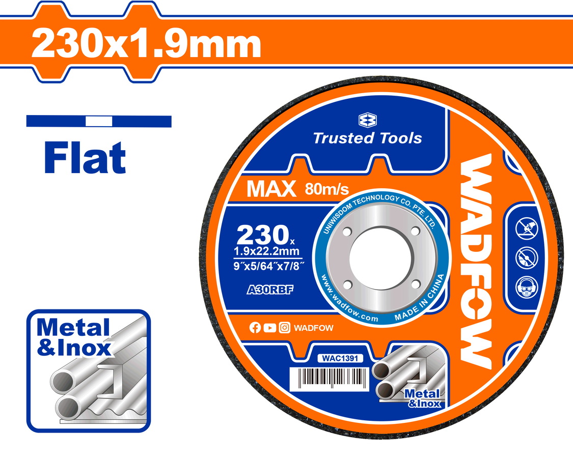 Selon le site officiel et les distributeurs de WADFOW, le WAC1391 est un disque abrasif à centre plat utilisé pour couper le métal et l’inox (acier inoxydable) .