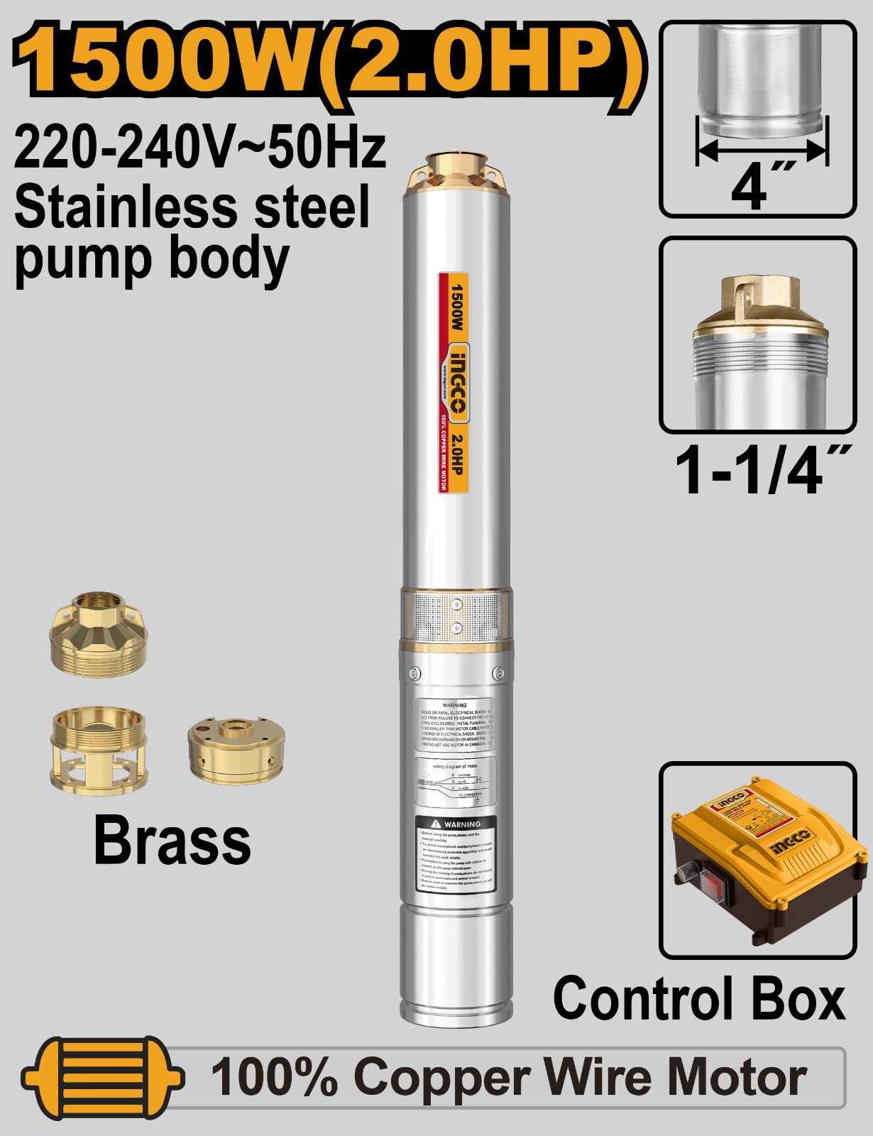 POMPE IMMERGEE 4″1500W/2HP+BOITIER POUR PUIT PROFOND DWP150062